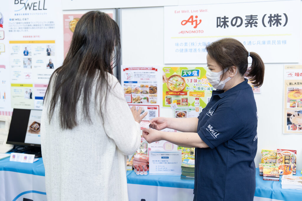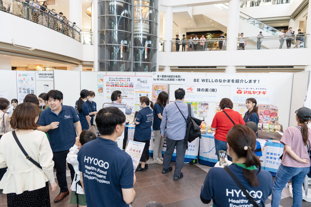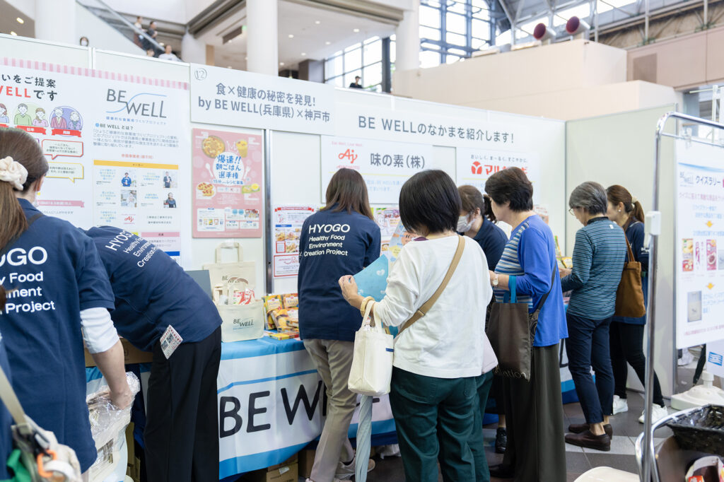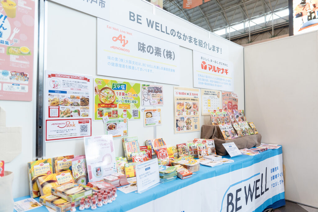 「ひょうご健康的な食環境づくりプロジェクト(愛称:BE WELL)」参加企業である、コープこうべ、味の素株式会社大阪支社、株式会社マルヤナギ小倉屋と、兵庫県・神戸市が一緒になってイベントに来られた方々に食と健康の楽しさを伝えるため、『食×健康の秘密を発見!by BE WELL(兵庫県)×神戸市』を出展しました。
