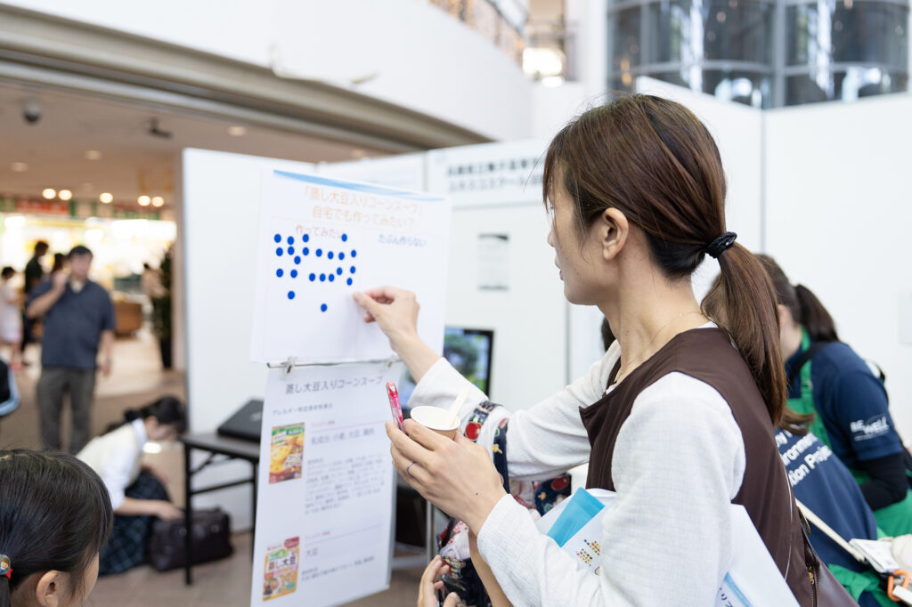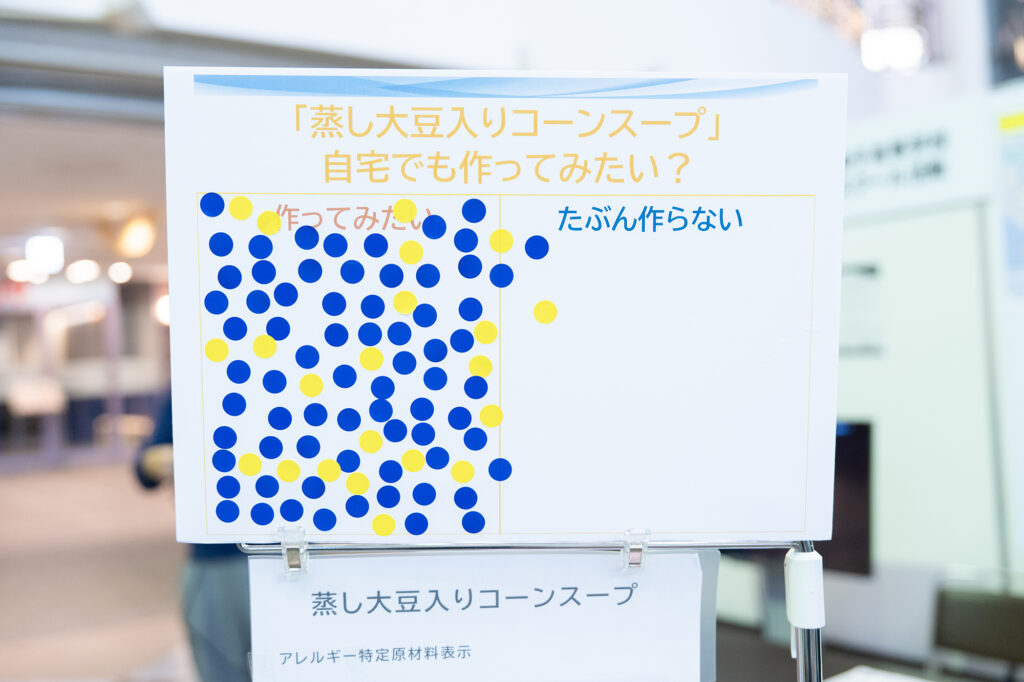 試食後は『蒸し大豆入りコーンスープ』を自宅でも作ってみたいかのアンケートを実施。多くの方が「作ってみたい」と答えてくれました。